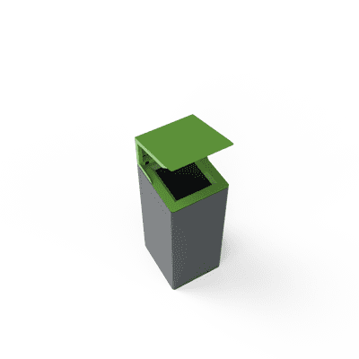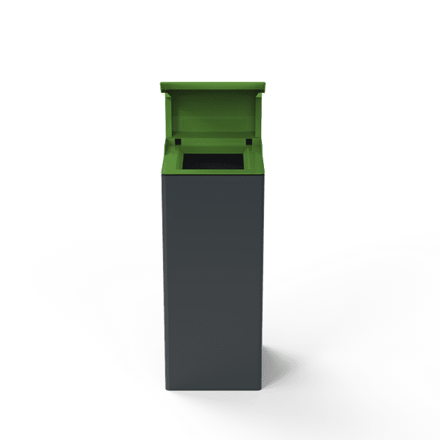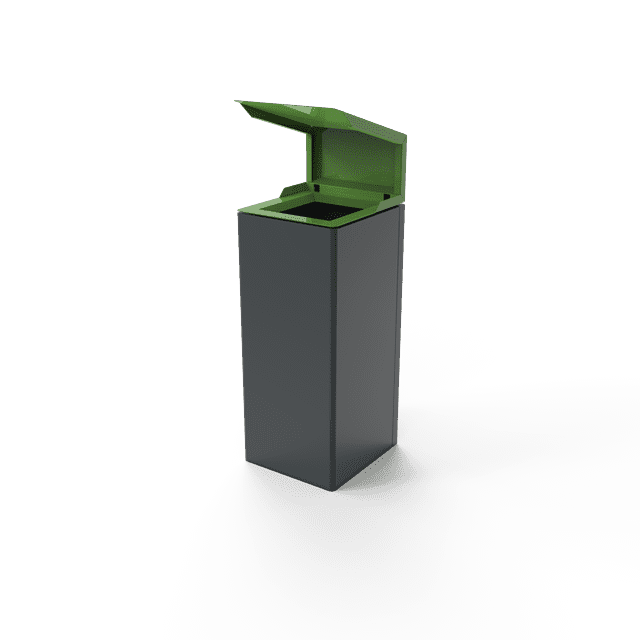 Nemo outdoor litter bin features a durable mild steel body with a zinc-rich powder-coated finish, a top opening with a rain cover, and SS 316 stainless steel accessories. A galvanized steel inner container securely holds waste bags for efficient disposal.